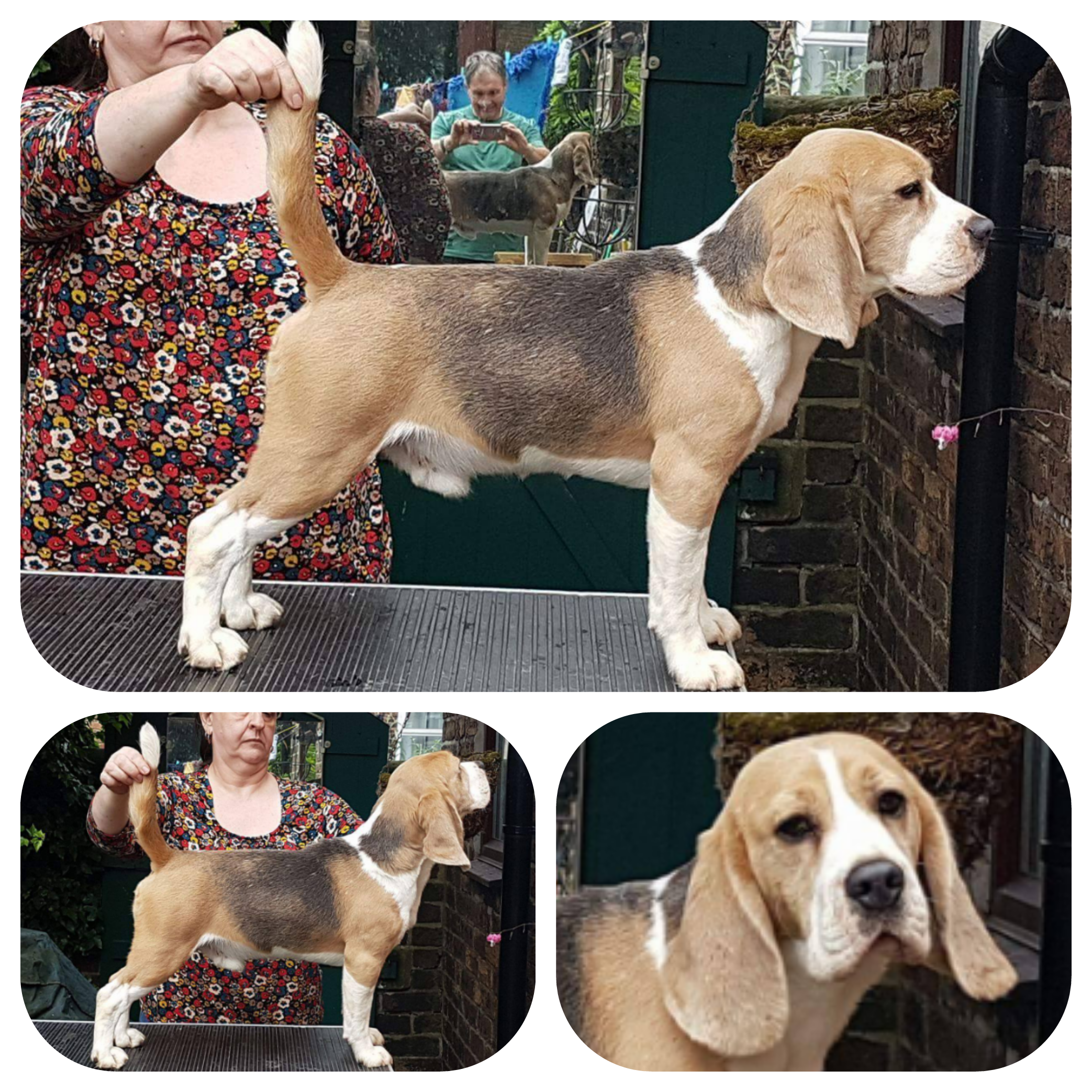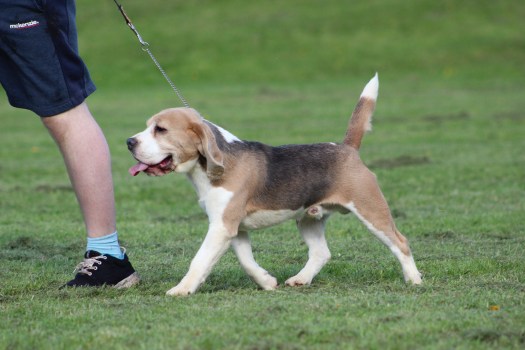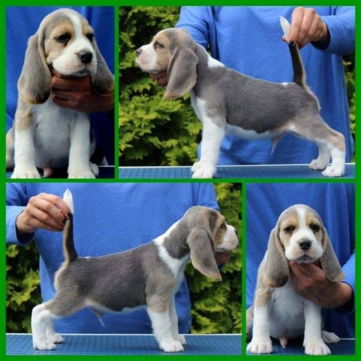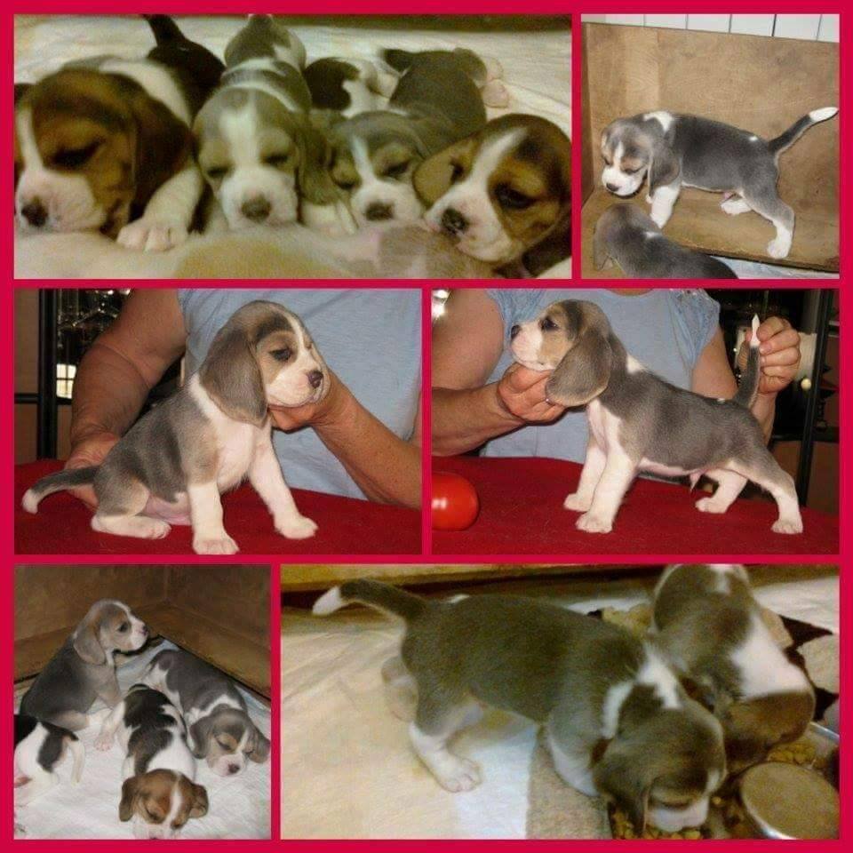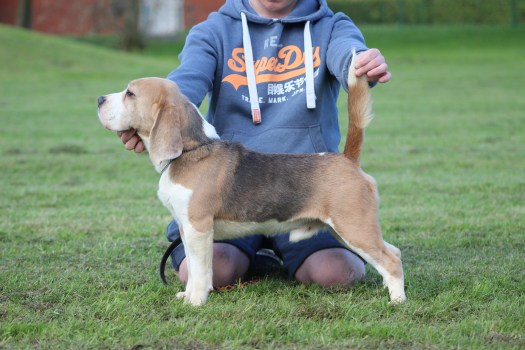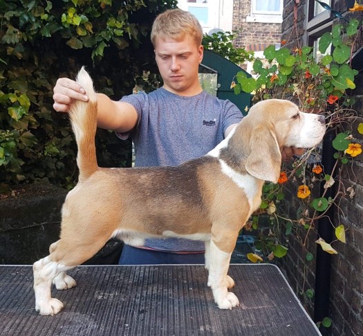 Spencer is the only Blue Tri colour stud dog in the UK. The colour is totally acceptable to the Kennel Club and can be shown however, very few are ever seen in the UK as they are rarely produced. In the USA and Europe they are shown regularly and some of the high winning show dogs are blue. To be able to have blue puppies from Spencer your bitch must recessively carry the blue dilution gene. It is out in British beagle lines but you won’t know if you have it unless you DNA test your bitch to see what colours she carries. If your bitches doesn’t carry the blue colour as Spencer is a full blue tri all his children will carry blue so if you kept a bitch from the puppies and mate to either another solid blue or a blue carrying boy you will get blue puppies. We are breeding and increasing are blues and blue carries so we will have an unrelated blue stud dog that we will allow people to put back to Spencer daughter’s in future. Spencer is a very loving boy who is constructed correctly has a lovely head with great expression and produces great ear length and really great tails straight and well set on. He has a great extended side gait and his children all move well. Here are photos of Spencer now his photo pedigree showing the actual International Champion beagles in his pedigree. Then pictures of Spencer as a puppy and then with his litter some normal tri colour some blue tri bitches he was the only blue tri boy.